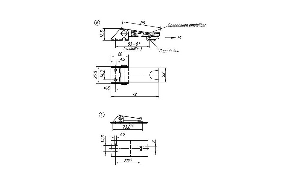 Die Haltekraft F1 bezieht sich auf den Spannverschluss nicht auf den Gegenhaken.
