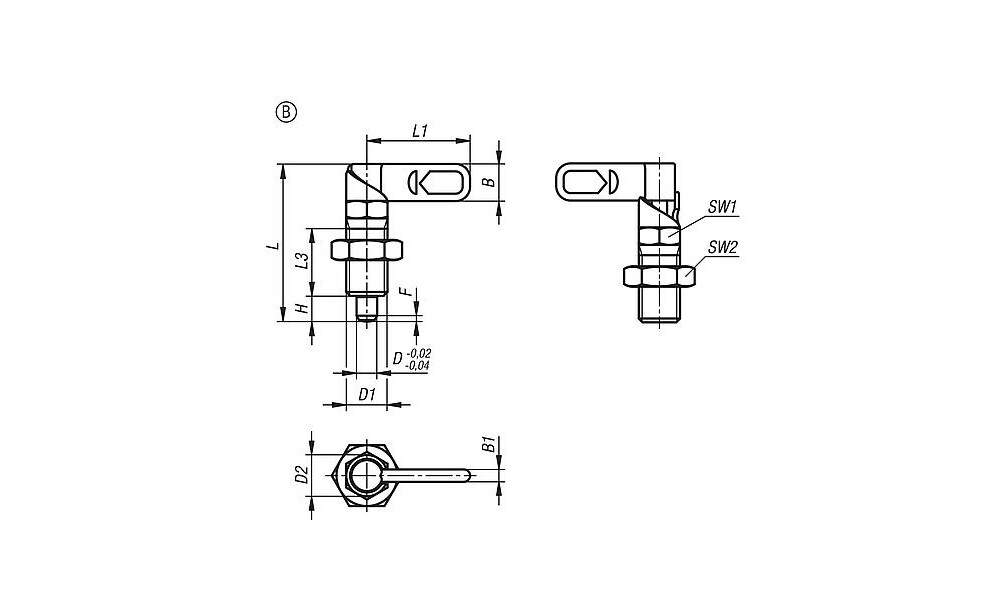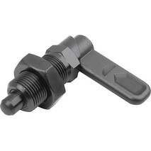 Sperrriegel werden dort eingesetzt, wo eine Veränderung der Arretierstellung durch Querkräfte verhindert werden soll. Durch Drehen des Riegels um 180° wird der Arretierstift eingezogen, somit kann die Arretierstellung verändert werden. Die Rastkerbe bewirkt, dass der Riegel in dieser Stellung gehalten wird und damit der Arretierstift eingezogen bleibt. Durch einen 180°-Anschlag wird das Überspringen der Rastkerbe und somit ein erneutes Ausfahren des Arretierstiftes verhindert. Mit Auswahl der Anschlagseite (links, rechts) wird die Drehrichtung des Riegels definiert. Werkstoff: Riegel 1.0503. Gewindehülse und Arretierstift Automatenstahl. Druckfeder 1.4310. Ausführung: Gewindehülse und Riegel brüniert. Arretierstift gehärtet, geschliffen und brüniert. Druckfeder blank. Vorteile: Durch Drehen des Riegels um 180° wird der Arretierstift eingezogen. 180°-Anschlag mit einseitiger Drehrichtung. Auf Anfrage: Sonderausführungen. Zubehör: Haltestücke K0638. Positionierbuchsen K1290, K1839, K1840. Zeichnungshinweis: 1) Anschlag links 2) Anschlag rechts