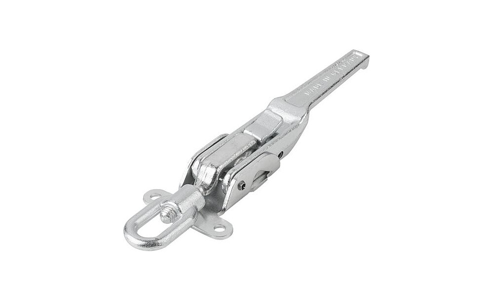 Schwere, geschmiedete Spannverschlüsse für hohe Zugbelastungen, die vorzugsweise im Nutzfahrzeug- und Landmaschinenbau sowie bei Baumaschinen eingesetzt werden. Im geschlossenen Zustand ist der Verschluss durch eine Raste gegen ungewolltes Öffnen gesichert.