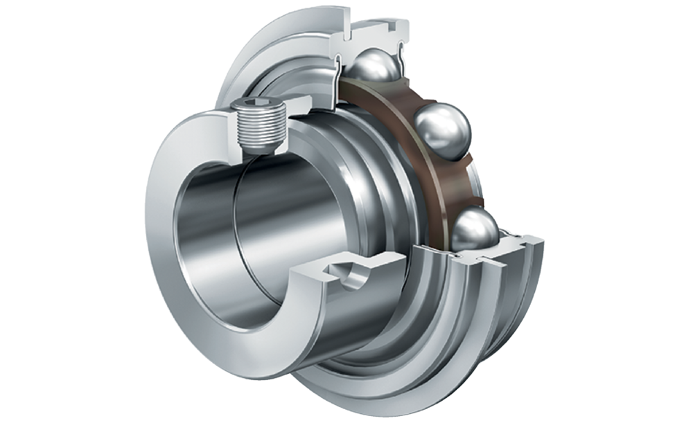 Spannlager RAE..-NPP-NR, zylindrischer Außenring, Befestigung durch Exzenterspannring, Nuten im Außenring, beidseitig P-Dichtung