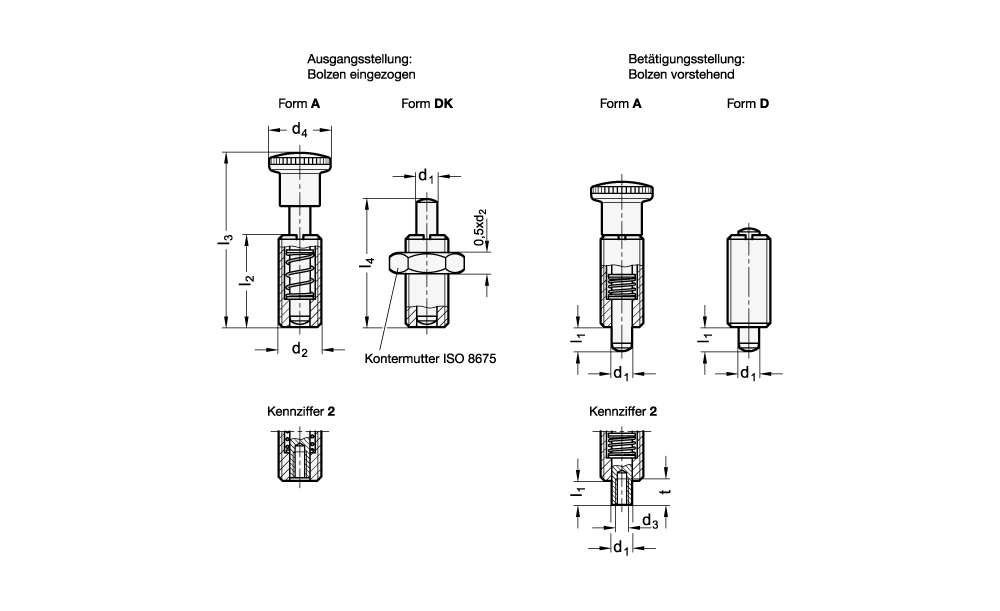 Bei Federbolzen GN 313 ist der Bolzen in der unbetätigten Stellung nicht vorstehend.