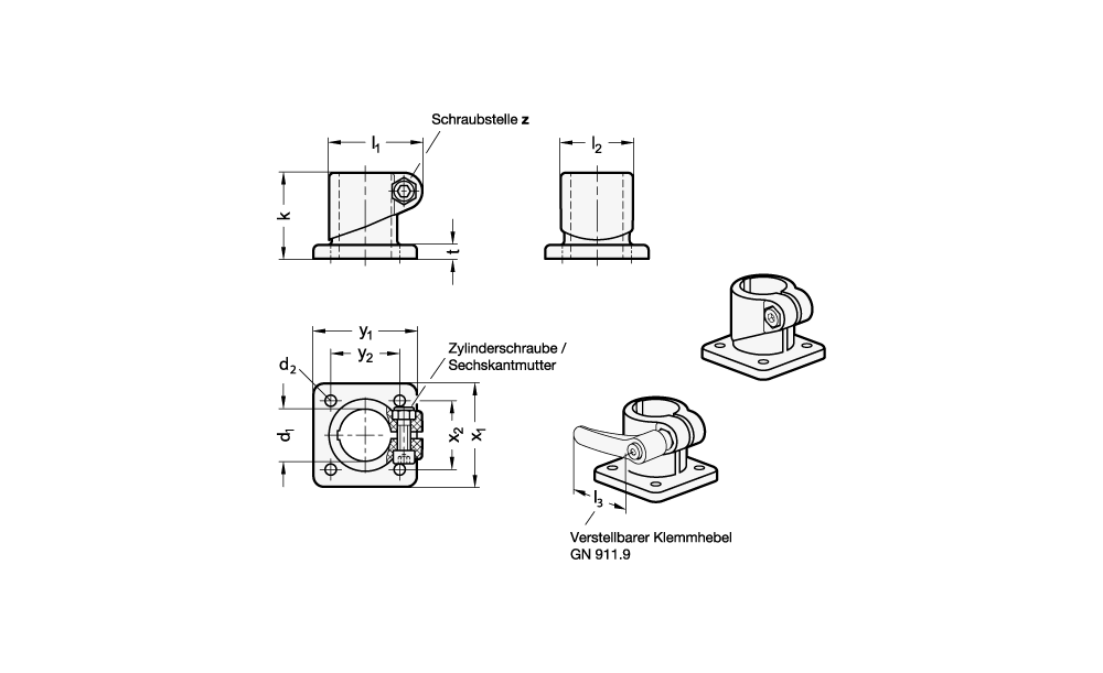 Wenn werkzeuglos geklemmt werden soll, kann die Zylinderschraube durch einen in der Tabelle als Zubehör angegebenen verstellbaren Klemmhebel GN 911.9 ersetzt werden.