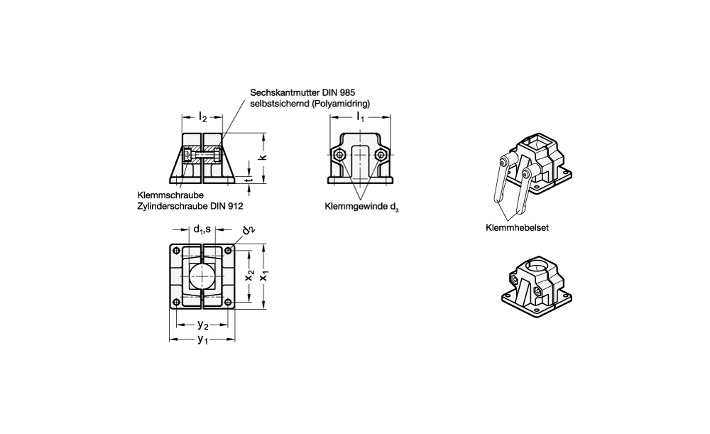 Wenn werkzeuglos geklemmt werden soll, können die Zylinderschrauben, durch die in der Tabelle als Zubehör angegebene verstellbaren Klemmhebel GN 911 ersetzt werden.