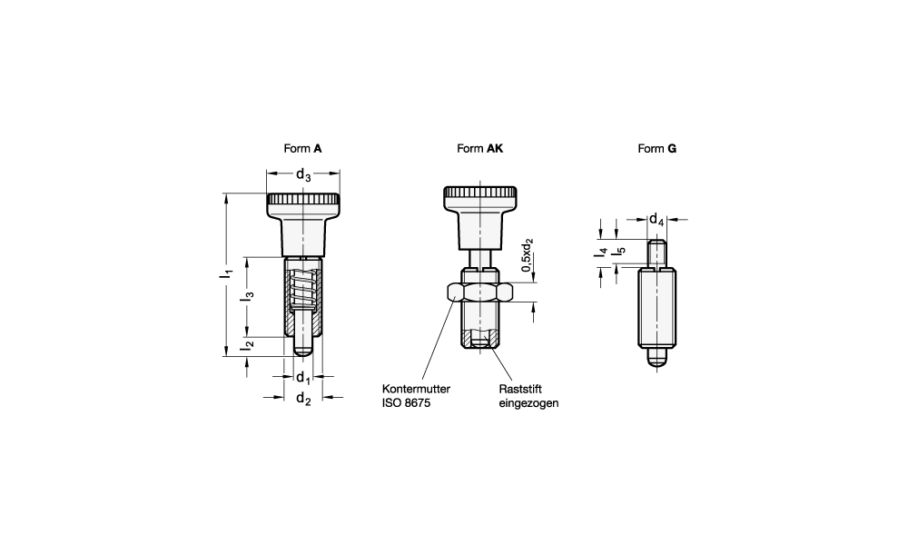Rastbolzen GN 613 in der Form G bzw. GK mit Gewindezapfen sind für Anwendungsfälle gedacht, wo ein Sonderknopf erforderlich ist bzw. die Betätigung des Rastbolzens nicht in der üblichen Weise von Hand erfolgt.