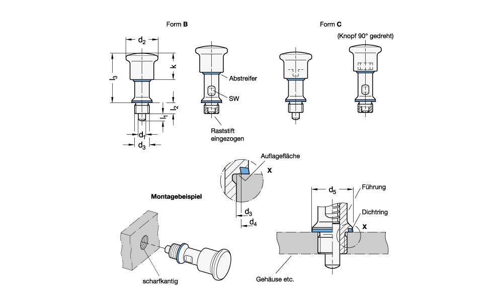 Abstreifer zwischen Knopf und Führung sowie der Dichtring zwischen Führung und Gehäuse halten die Rastmechanik auf der Knopfseite dicht. Gleichzeitig verhindern die hohe Oberflächengüte (Ra < 0,8="" µm)="" und="" die="" totraumfreie="" befestigung="" das="" anhaften="" von="" schmutz="" bzw.="" erleichtern="" die="" reinigung.="" rastbolzen="" mit="" rastsperre="" form="" c="" werden="" eingesetzt,="" wenn="" der="" raststift="" zeitweise="" nicht="" vorstehen="" soll.="" hierzu="" wird="" der="" knopf="" nach="" dem="" einziehen="" des="" stiftes="" um="" 90°="" gedreht.="" durch="" eine="" rastkerbe="" wird="" der="" knopf="" in="" dieser="" position="" gehalten.="" befestigungs-="" bzw.="" durchgangsbohrungen="" am="" gehäuse="" müssen="" rechtwinklig,="" gratfrei="" und="" ohne="" fase="" ausgeführt="" werden.="" dadurch="" wird="" die="" funktion="" der="" dichtringe="" sichergestellt.="">