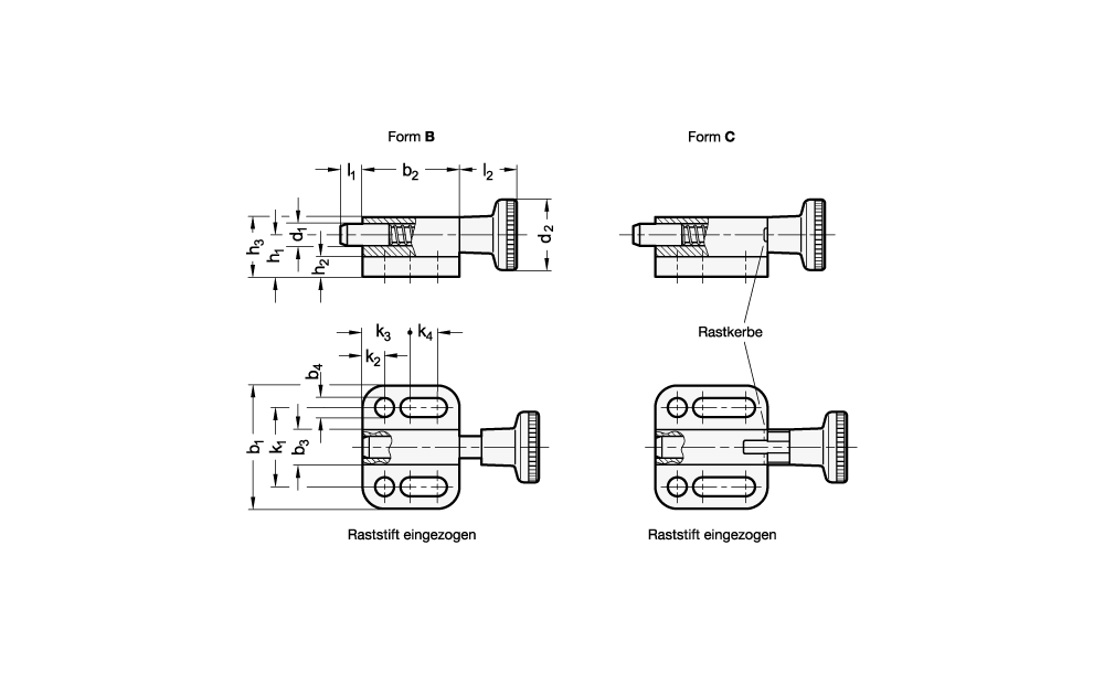 Rastbolzen mit Rastsperre (Form C) werden eingesetzt, wenn der Raststift zeitweise nicht vorstehen soll. Hierzu wird der Knopf nach dem Herausziehen um 90° gedreht. Durch eine Rastkerbe wird der Knopf in dieser Position gehalten.