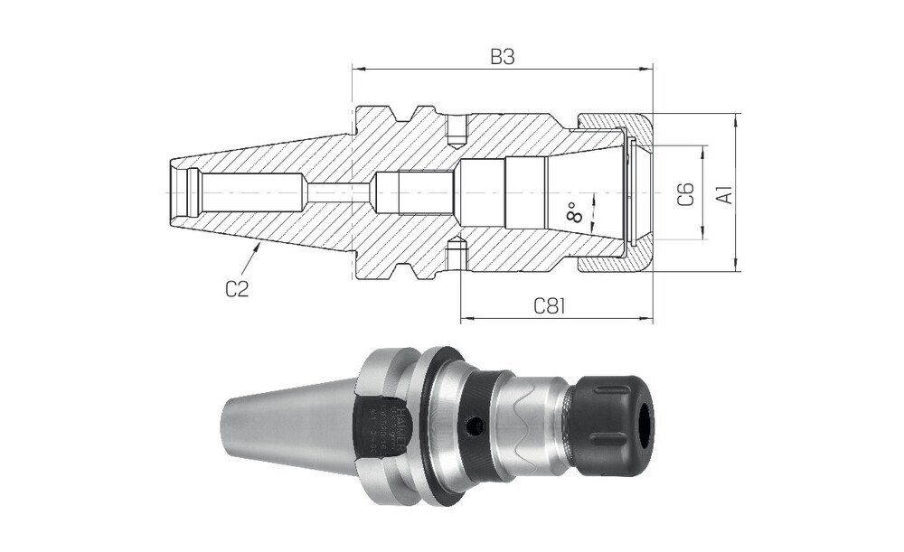 Auch für Standard-Spannzangen ER nach ISO 15488. Achtung: Bei Verwendung von Standard ER Spannzangen wird das A-Maß länger