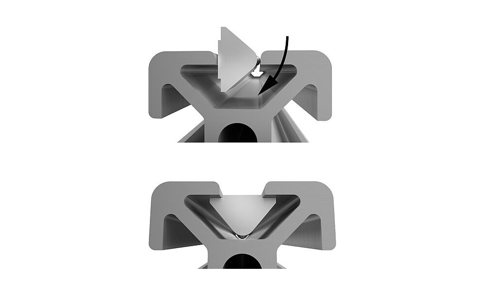 Der Nutenstein wird in die Profilnut eingeschwenkt und kann somit auch in bestehende Systeme nachträglich eingebracht werden. Durch die federnd gelagerte Kugel ist eine Fixierung des Nutensteins an jeder beliebigen Stelle in der Profilnut möglich. Der Steg zentriert den Nutenstein in der Profilnut und gewährleistet dadurch immer eine optimale Auflagefläche.