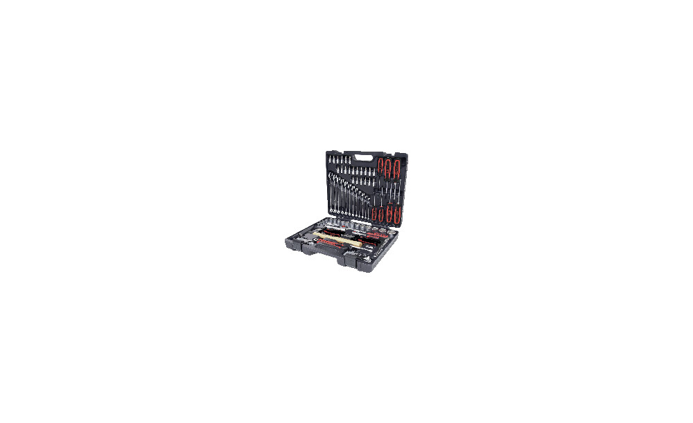 - Steckschlüssel-Satz mit kurzen und langen Steckschlüssel-Einsätzen, Bit-Schrauber-Einsätzen, Schraubendrehern und Ring-Maulschlüsseln