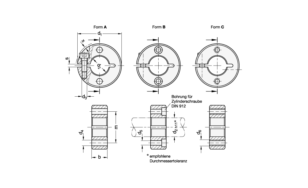 Mit geschlitzten Stellringen GN 7062.2 werden z. B. Achsen an Gehäusen befestigt oder Räder und Scheiben auf Wellen montiert. Sie lassen sich einfach und sicher mit starker Klemmkraft durch Reduzierung der Schlitzhöhe montieren, ohne die Oberfläche von Wellen und Achsen zu beschädigen. Das Gewinde d3 ist bei den Größen d1 = 30 bis 36 als Durchloch, ab Größe d1 = 42 als Sackloch ausgeführt.