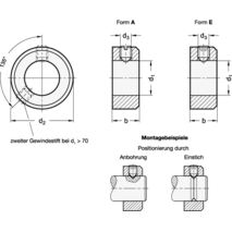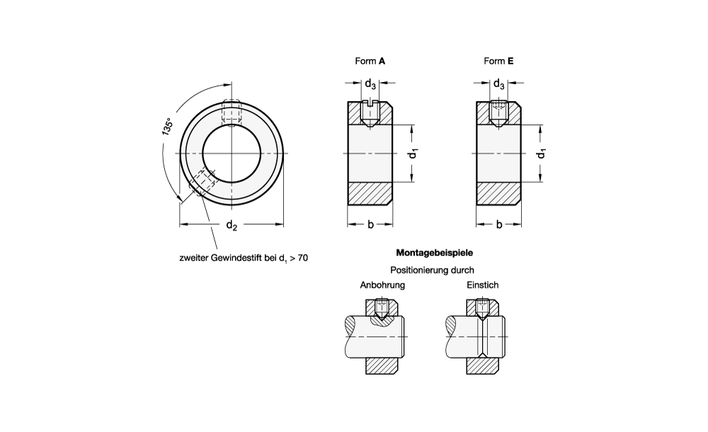 Die Klemmung erfolgt radial auf der Wellen- oder Achsenoberfläche. In Verbindung mit einer Anbohrung oder einem Einstich am Aufnahmedurchmesser lassen sich die Stellringe exakt positionieren und gleichzeitig werden dadurch Beschädigungen an der Klemmstelle vermieden.