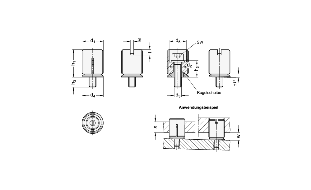 Sie bestehen aus einer Nivellierschraube, einer Zylinderschraube mit Scheibe und einer Kugelscheibe. Nach erfolgter Justierung mittels des als Zubehör erhältlichen Montagewerkzeugs GN 355.1 wird die Schraube fest angezogen wodurch sich die Nivellierschraube durch die unterlegte Kugelscheibe DIN 6319 spreizt und somit in der Gewindebohrung gegen Verdrehen gesichert wird.