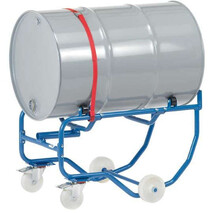 - Pulverbeschichtung: RAL 5007 blau Ausführung: Mit Kunststoff-Rollen zum Drehen des Fasses.