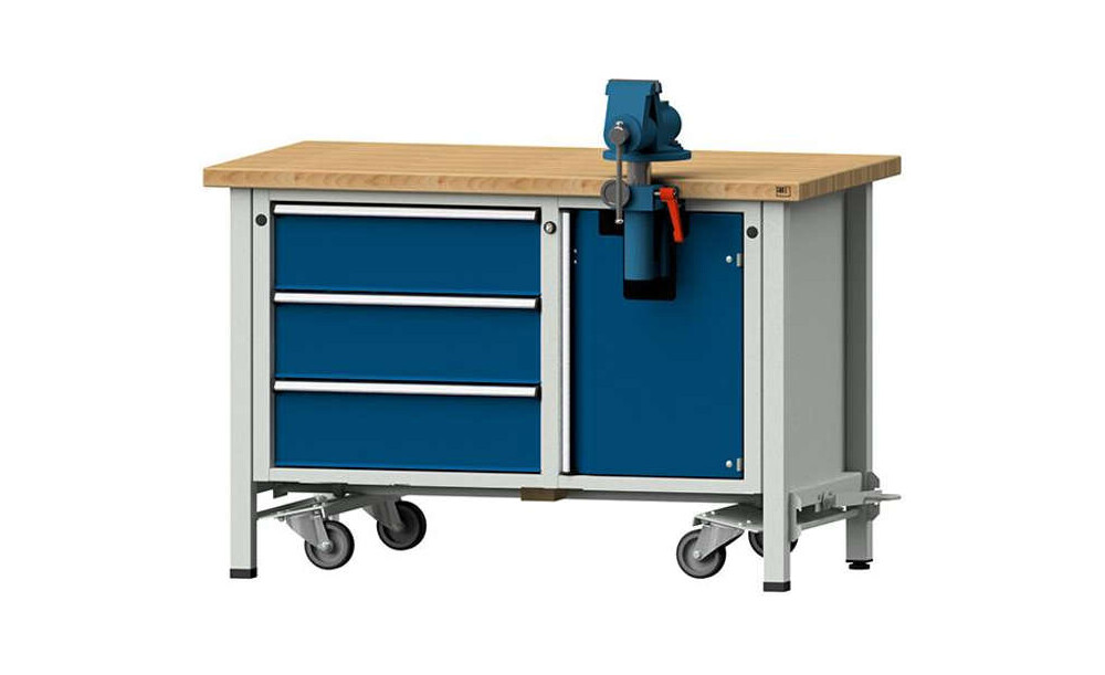 -Fahrbare Montagewerkbank (Serie V) mit 3 Schubladen (3x180 mm) Die Gesamttraglast der Montagewerkbänke beträgt stationär 1500 kg, fahrbar 450 kg.