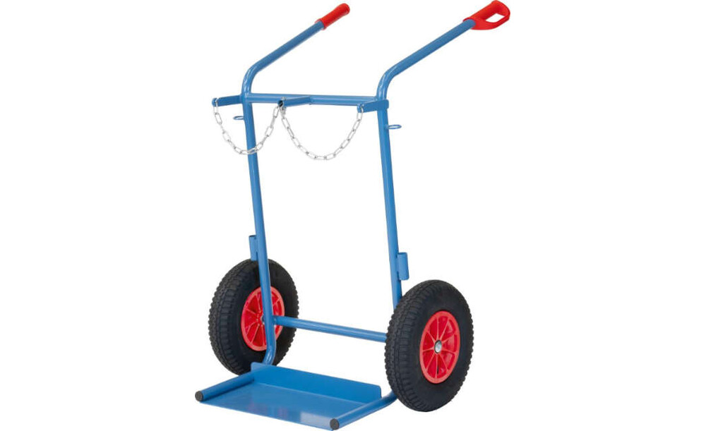 -Stahlflaschen-Karre für 2 Flaschen à 40–50 l Inhalt (Ø 204–229 mm), mit Schweißdrahtköcher Die Stahlflaschen-Karre ist zum Transport von 2 Stahlflaschen à 40–50 l Inhalt, Ø 204–229 mm geeignet.