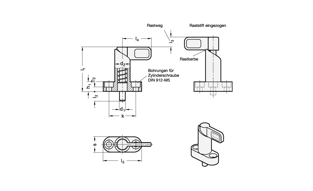 Rastriegel GN 612.10 werden eingesetzt, wenn der Raststift zeitweise nicht vorstehen soll. Durch Drehen des Riegels um 180° wird der Raststift eingezogen. Die Rastkerbe ermöglicht ein sicheres Positionieren.