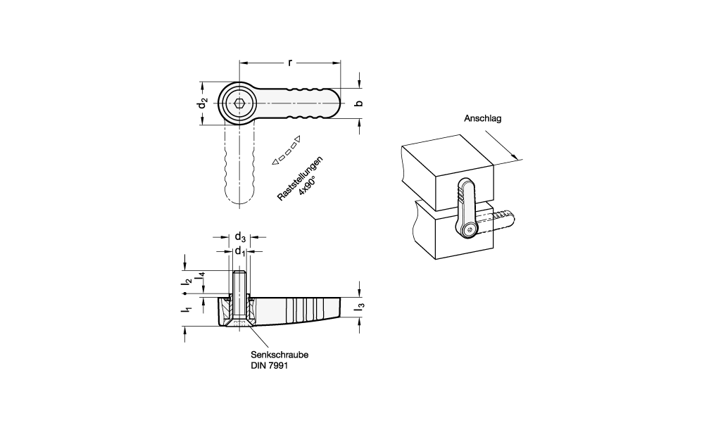 Die innenliegende Kugel-Feder-Rastmechanik verfügt über 4 Raststellungen im Abstand von je 90°. Dank der Befestigung mittels der Senkschraube kann die Rastposition beliebig gewählt werden.