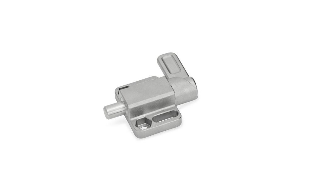 Bei Federriegeln GN 722.3 wird der Raststift über die Kurve der Führung durch eine 180°-Drehung des Riegels eingezogen. Die Rastkerbe am oberen Ende der Kurve bewirkt, dass der Riegel gehalten wird wenn der Raststift zeitweise nicht vorstehen soll. Die Edelstahl A4-Ausführung ist für den Einsatz in besonders aggressiven Umgebungen vorgesehen.