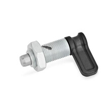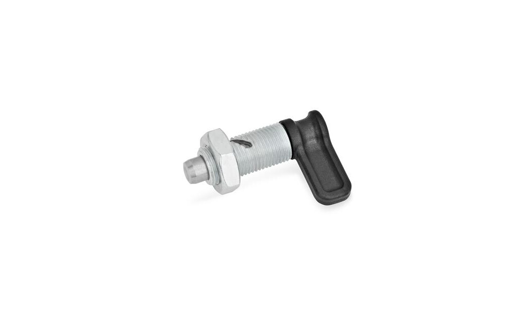 Kurven-Rastriegel GN 712 werden eingesetzt, wenn der Raststift zeitweise nicht vorstehen soll. Durch Drehen des Riegels um 90° bzw. 120° entgegen dem Uhrzeigersinn wird der Raststift über eine Führungskurve eingezogen.
