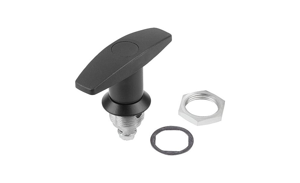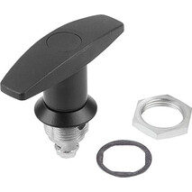 Drehriegel mit T-Griff. Rechts oder links einsetzbar mit einem Schließweg von 90°. Der Drehriegel kann vormontiert eingebaut werden. Die Befestigungsmutter ist einseitig als Erdungsmutter mit Krallen ausgeführt.