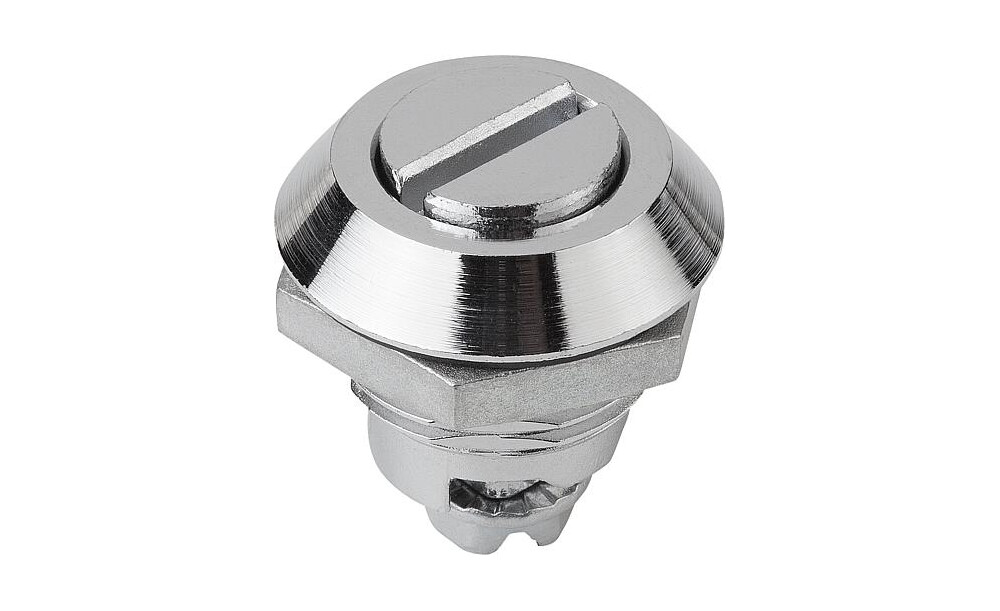 Drehriegel mit federgelagerter Zunge. Rechts oder links einsetzbar mit einem Schließweg von 90°. Der Drehriegel kann vormontiert eingebaut werden. Die Befestigungsmutter ist einseitig als Erdungsmutter mit Krallen ausgeführt.
