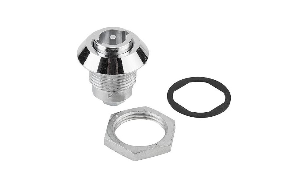 Drehriegel mit federgelagerter Zunge. Rechts oder links einsetzbar mit einem Schließweg von 90°. Der Drehriegel kann vormontiert eingebaut werden. Die Befestigungsmutter ist einseitig als Erdungsmutter mit Krallen ausgeführt.