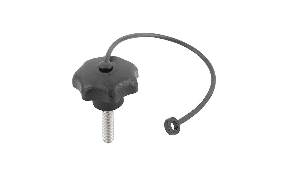Werkstoff: Sterngriff aus Thermoplast, Gewindebolzen aus Edelstahl 1.4305. Sicherungsband aus elastischem TPU. Ausführung: Gewindebolzen blank. Hinweis: Durch das Sicherungsband kann der Sterngriff unverlierbar an einem Grundkörper befestigt werden. Der Sterngriff verbleibt in unmittelbarer Umgebung am Gegenstand. Dadurch kann die Montage / Demontage des Sterngriffes vereinfacht und verlustsicherer durchgeführt werden. Montage: Montage im nicht gespannten Zustand des Bandes ausführen. Ein- wie ausgeschraubter Zustand ist zu beachten.