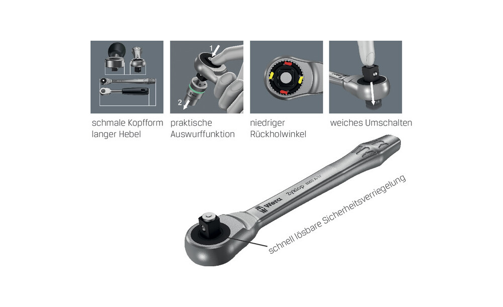 - Ausführungweiches Umschalten durch unverlierbaren Durchsteckvierkant, mit sicherer Nussverriegelungsfunktion, hohe Robustheit ohne Drehmomentbeschränkung, geschmiedete Vollmetallknarre aus Chrom-Molybdän, feinverzahnt