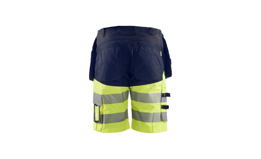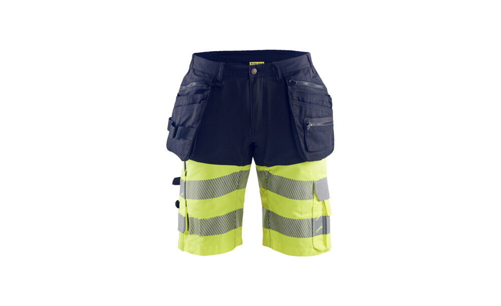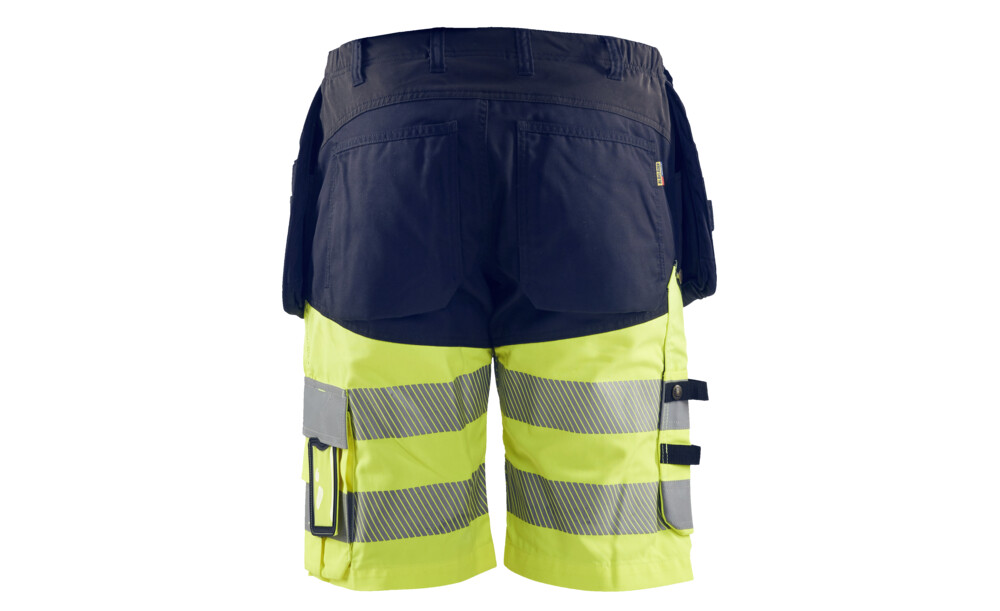 High Vis Shorts mit 4-Wege-Stretch Einsätzen an der vorderen und hinteren Passe. Mit extra breiten Holstertaschen, Gesäßtaschen und einer Zollstocktasche, die mit CORDURA® verstärkt ist. Unterbrochene Reflexstreifen um die Beine herum sorgen für mehr Bewegungsfreiheit und erhöhen die Sichtbarkeit. Zertifiziert nach EN ISO 20471 Standard, Klasse 1.