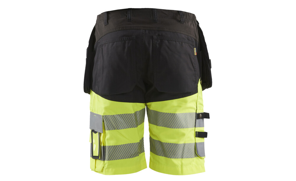High Vis Shorts mit 4-Wege-Stretch Einsätzen an der vorderen und hinteren Passe. Mit extra breiten Holstertaschen, Gesäßtaschen und einer Zollstocktasche, die mit CORDURA® verstärkt ist. Unterbrochene Reflexstreifen um die Beine herum sorgen für mehr Bewegungsfreiheit und erhöhen die Sichtbarkeit. Zertifiziert nach EN ISO 20471 Standard, Klasse 1.