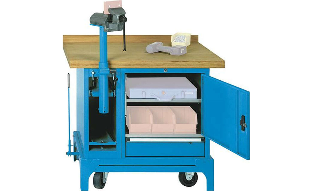 - Arbeitshöhe: 850 mm Schraubstock In Arbeitsstellung stabil und vibrationsfrei mit der Werkbank verbunden. Mit wenigen Handgriffen in den Unterbau versenkbar.