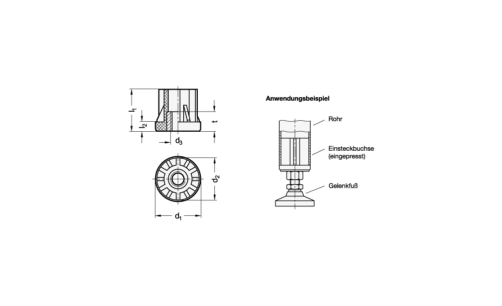 Einsteckbuchsen GN 448 ermöglichen die Montage von Schrauben in Rohren. Sie werden dabei über den leicht konisch zulaufenden Einsteckteil im Rohr gehalten.