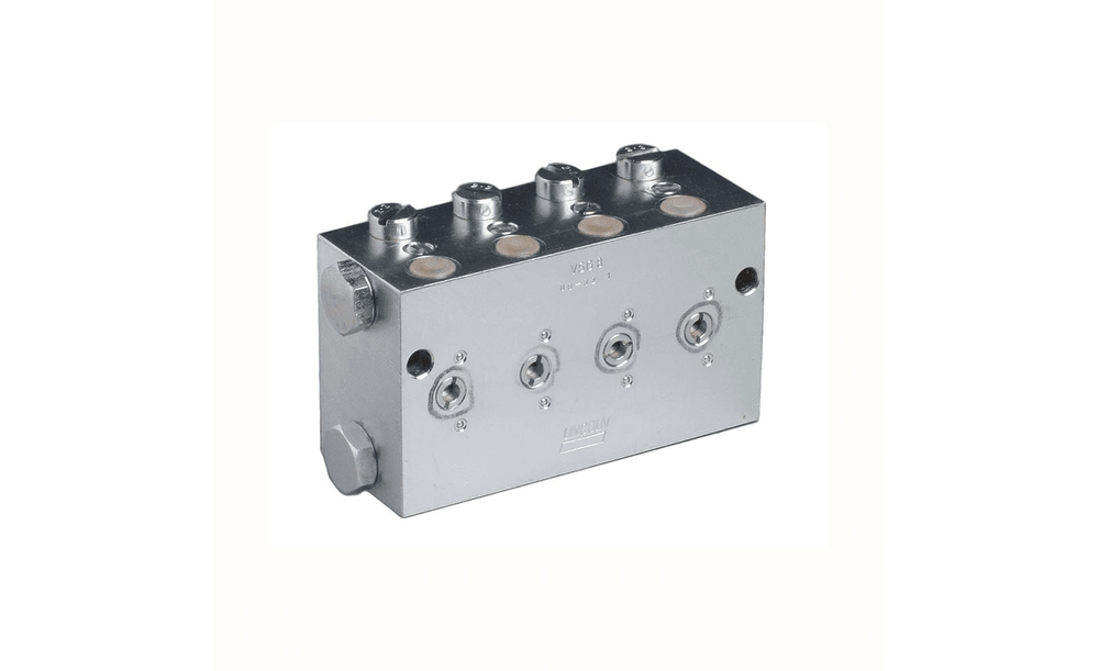 Zweileitungs-Schmierstoffverteiler Die robusten VSG Schmierstoffverteiler aus verzinktem Stahl sind für Zweileitungssysteme mit einem Druck bis 400 bar (5 800 psi) ausgelegt. Diese Schmierstoffverteiler sind mit bis zu acht Auslässen verfügbar, wobei jedes Auslasspaar mit einem Anzeigestift zur visuellen Überwachung ausgestattet ist. Die VSG Schmierstoffverteiler sind zudem mit verschleißarmen Näherungsschaltern oder Kolbendetektoren zur elektrischen Überwachung verfügbar (außer Ausführung VSG-D).