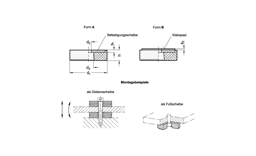 Fußscheiben werden zum Aufstellen von kleineren Maschinen, Anlagen oder Vorrichtungen verwendet und bei der Form A mit Schrauben befestigt. Dabei muss die max. Schraubenkopfhöhe beachtet werden. Alternativ lässt sich die Form B nach Abziehen der Schutzfolie auf allen geeigneten und sauberen Oberflächen über das Klebepad befestigen.