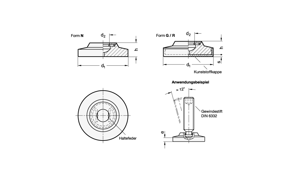 Die Formen KS und KR mit Kunststoffkappe verhindern Beschädigungen an empfindlichen Flächen. Durch die großen Tellerdurchmesser d1 bleibt die Flächenpressung in zulässigen Grenzen.