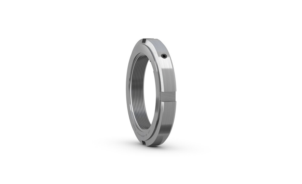 KMFE Wellenmuttern sind zur Befestigung von CARB Toroidalrollenlagern sowie von abgedichteten Pendelrollenlagern und abgedichteten Pendelkugellagern auf einer Welle vorgesehen. Sie reduzieren die Wellenkosten, da keine Keilnut erforderlich ist. Die integrierte Befestigungsschraube vereinfacht den Einbau; separate Befestigungstechnik ist nicht erforderlich. Der maximal zulässige Axialschlag zwischen Richtfläche und Gewinde beträgt 0,02 bis 0,03 mm. Vorteile: Keine Keilnut erforderlich;Einfache und robuste Befestigung für geeignete Anwendungen;Wiederverwendbar;Kostengünstig;Erhältlich für Gewinde M 20x1 bis M 200x3 (Größen 4 bis 40)