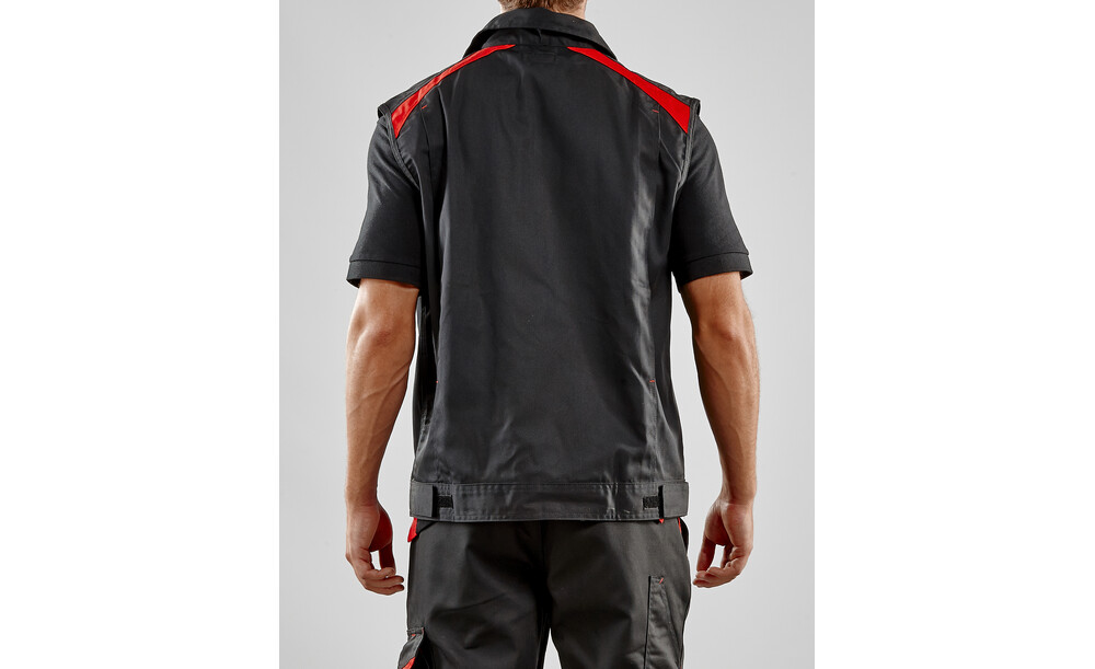 Arbeitsweste mit Details und Nahtverriegelungen in Kontrastfarbe und verstellbarem Saum. Bewegungsfalte am Rücken für bessere Bewegungsfreiheit.