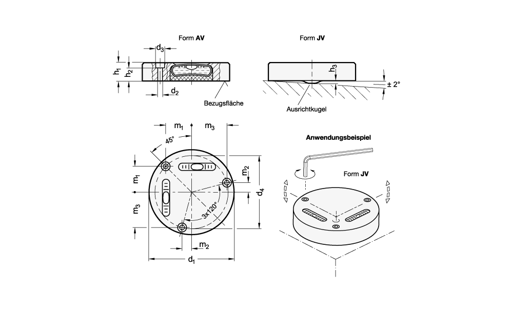 Die Libellen der Form JV werden beim Montieren über die um 120° versetzt angeordneten Befestigungsbohrungen ausgerichtet. Eine Ausrichtkugel an der Unterseite dient dabei als Kipppunkt. Durch gezieltes Anziehen lässt sich die Neigungsposition erreichen, bei der sich die Blasen innerhalb der mittigen Markierungsstriche befinden.