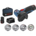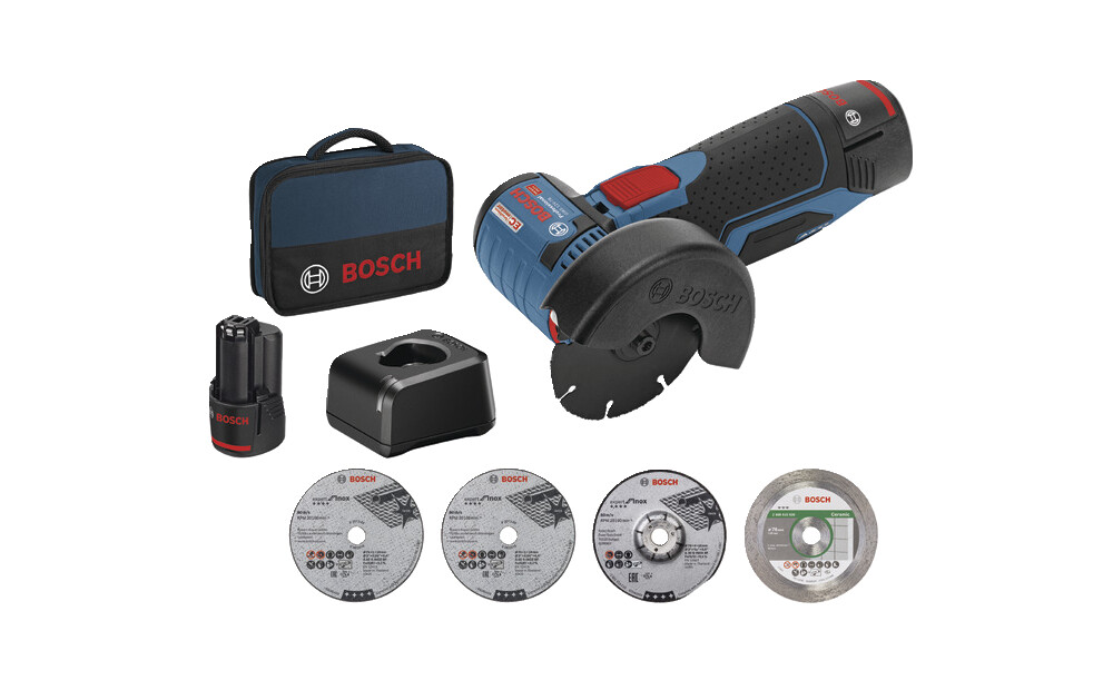 2 Li-Ion Akkus, Schnellladegerät, Diamant-Trennscheibe Best für Ceramic, HM-Trennscheibe Carbide Multiwheel, Schleifscheibe Expert for Inox, 2 Inox-Trennscheiben Expert for Inox, Schutzhaube, in hochwertiger Textiltasche.