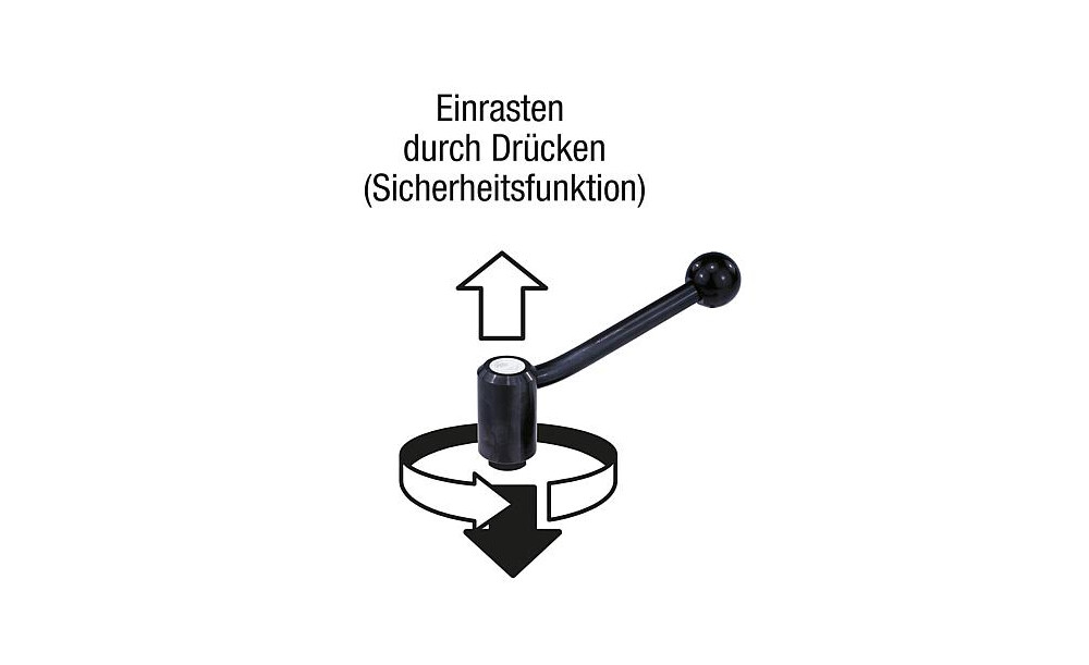 Um Spannhebel mit Sicherheitsfunktion betätigen zu können, müssen diese am Griff so weit eingedrückt werden, bis die Verzahnung vollständig eingerastet ist. Nunmehr kann gespannt oder gelöst werden. Durch Federdruck wird die Verriegelung sofort wieder freigegeben, so dass die Sicherheitsfunktion erneut vorhanden ist. (Griff läßt sich ohne Kraftaufwand drehen).