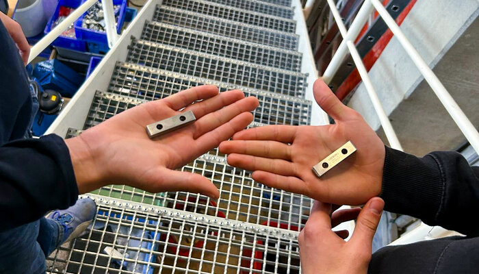 Der Rundgang führte die Gruppe weiter in die Werkstatt, wo Stefan Kölbl die verschiedenen Bereiche wie Schlauchabfertigung, Schienen- und Kettenbearbeitung vorstellte. Ein besonderes Highlight war die Demonstration von Michael Hager, der eine Schiene ablängte und daraus Mini-Schienen als Andenken für die Schülerinnen und Schüler fertigte.