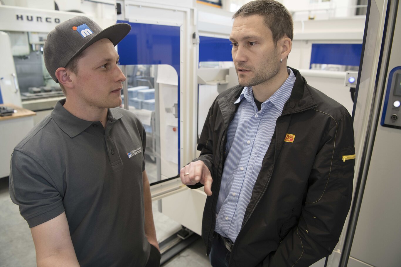 5 - Achs - Bearbeitungszentrum: Alles muss exakt sitzen. Stephan (li.) und Christian Mittermaier stellen die Aluminiumblöcke in der Werkstückautomatisierung ein.