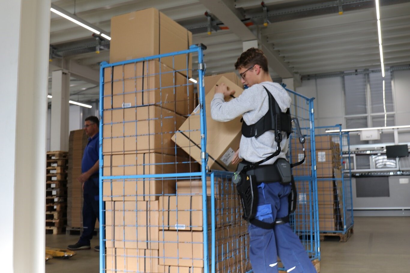 So ausgestattet, geht es an die jeweiligen Arbeitsplätze der Kollegen in der Logistik, um erste Erfahrungen mit den Systemen zu machen. Aufmerksamkeit erzielt die neue Ausrüstung auf jeden Fall gleich bei den anderen Kolleg:innen, den Probanden kommt das noch alles sehr ungewohnt vor. Dass man sich an das Tragen der Exoskelette zunächst gewöhnen muss, bestätigt auch der Produktexperte Sören Wöhe, verspricht aber auch, "Ihr werdet den positiven Effekt vielleicht noch nicht am ersten und auch noch nicht am zweiten Tag verspüren. Spätestens aber gegen Ende der Arbeitswoche stellen die meisten fest, dass die typischen Ermüdungserscheinungen nach einer anstrengenden Woche deutlich geringer ausfallen."