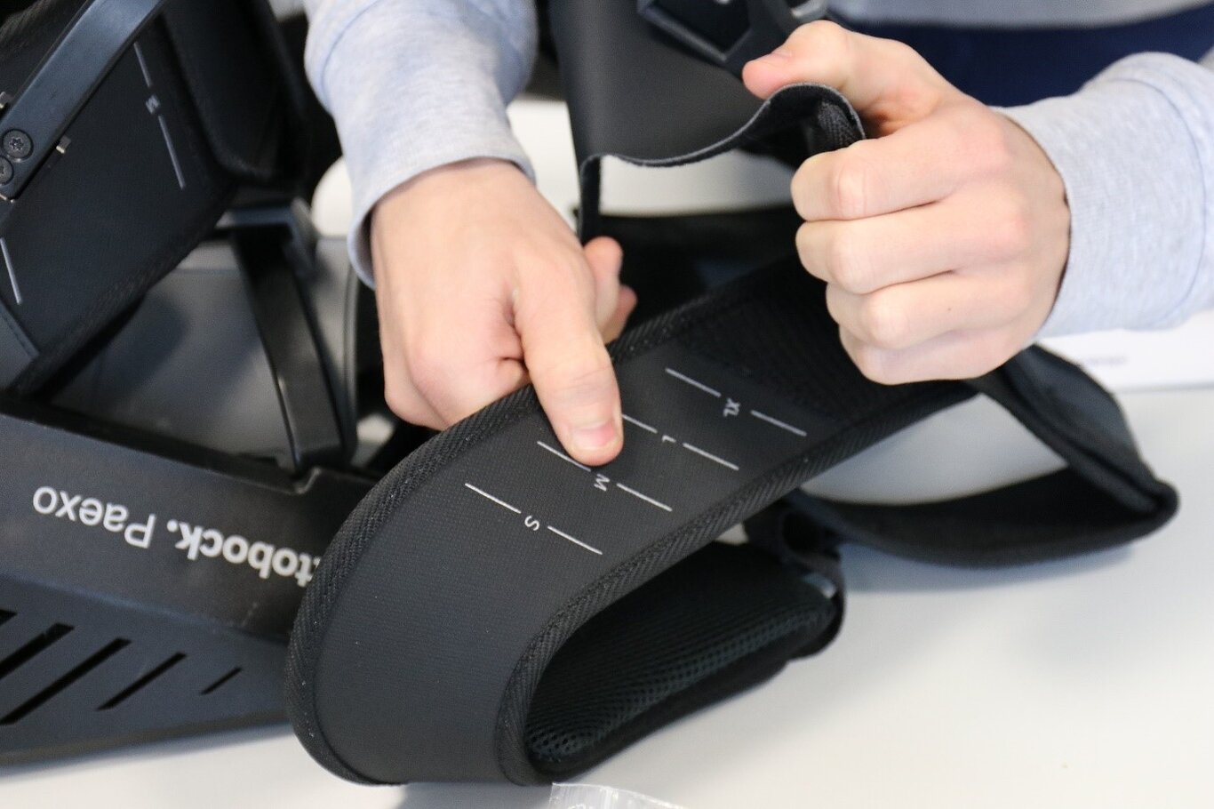 Dann geht es an die Anprobe der Exoskelette. Wie diese korrekt angelegt werden und an die individuelle Person angepasst werden können - führt Sören Wöhe zunächst vor. Von 1,60 bis 1,90 Metern Körpergröße und Kleidergrößen von XS bis XXL können die Exoskelette eingestellt werden. Schließlich legen die Kollegen dann ihre Modelle selbst an.