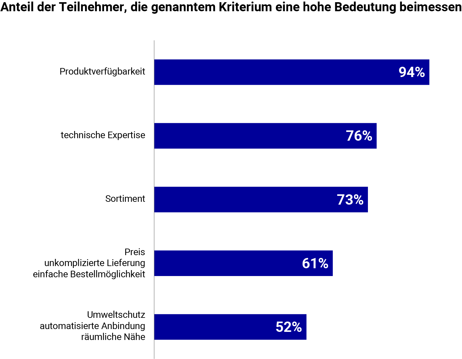 Produktverfügbarkeit ist klarer Sieger bei den Kriterien zur Auswahl und Zusammenarbeit mit einem Technischen Händler. Dieser Effekt dürfte sich angesichts der Erlebnisse der letzten Monate eher weiter verstärken. Die Absicherung der Lieferbarkeit der benötigten Produkte ist wichtiger denn je und erfordert starke Partner im Handel.