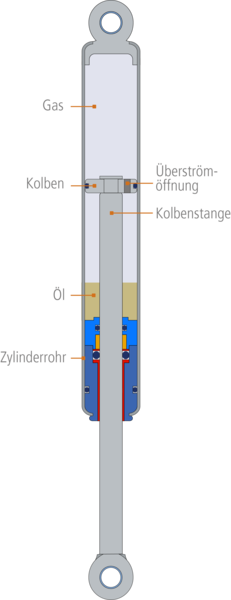 Um die einfach umzusetzenden Variationsmöglichkeiten aufzuzeigen, die wir auch nutzen um bestehende Kundensysteme zu optimieren, möchten wir Ihnen zunächst den Aufbau und die Funktion einer Standardgasfeder schildern und was daran ohne großen Aufwand oder Kosten geändert werden kann: