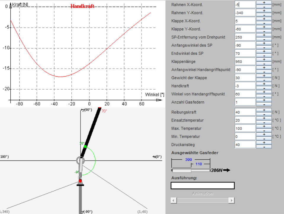 Am Markt gibt es hier eine Vielzahl fertiger Standardfedern. Oft werden dabei der mögliche Hub in z. B. 50 mm-Schritten und die Ausschubkraft 100 N-Weise vorgegeben. Dann muss die Konstruktion an die Feder angepasst werden, um im vorhandenen Bauraum ein akzeptables Ergebnis zu erreichen. Das klappt mal besser und mal schlechter.