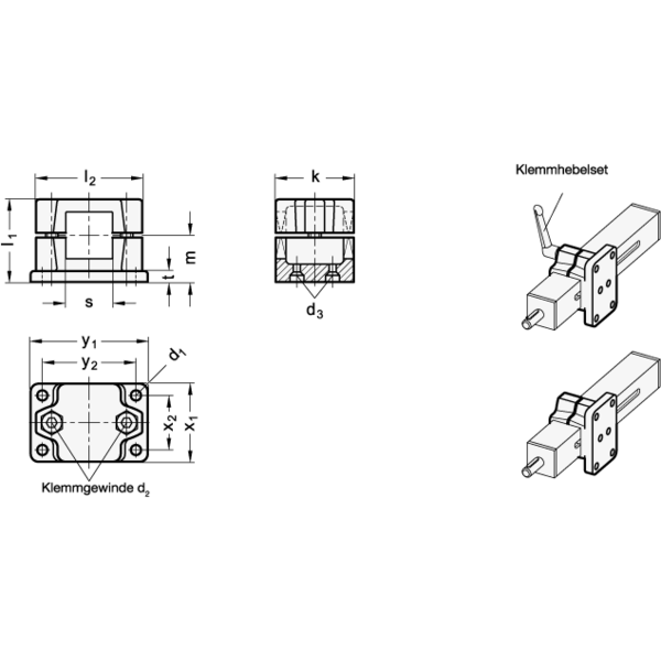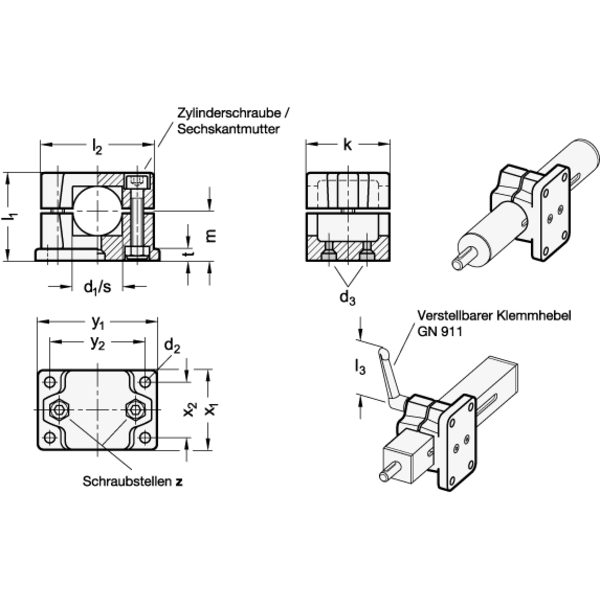 Wenn die Klemmung schnell und werkzeuglos erfolgen soll, können die Zylinderschrauben durch die in der Tabelle als Zubehör angegebenen verstellbaren Klemmhebel GN 911 ersetzt werden.