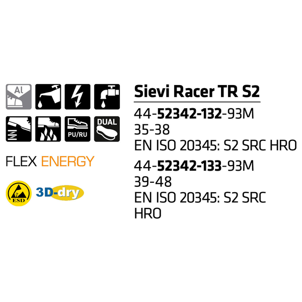 Der sportlich-leichte Aufbau, das den Fuß anatomisch stützende, atmungsaktive Design und die Sievi TractionPro®-Antirutschsohle machen den Racer zu einem überlegenen Sicherheitsschuh. Der Zehenschutz ist aus Aluminium. Das FlexEnergy®-Element fängt mehr als 55 % der kinetischen Energie auf und gibt sie an den Bewegungsapparat zurück. Mit Schnürsenkeln zur perfekten Anpassung an die Fußform.