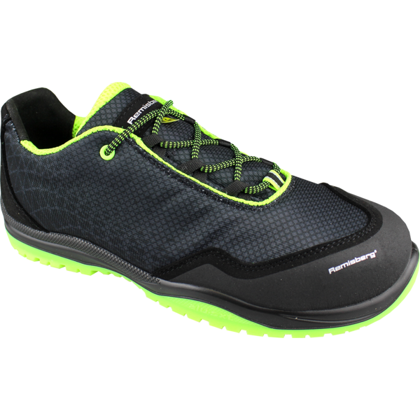 Sportlicher S3 ESD-Sicherheitshalbschuh Form A aus AIRWIND-Polyester-Gewebe mit spezieller 2-Schichten-PU-Laufsohle, atmungsaktives Futter, Aluminiumschutzkappe und durchtrittsichere ENIGMA ZERO HT2K-Textilzwischensohle.